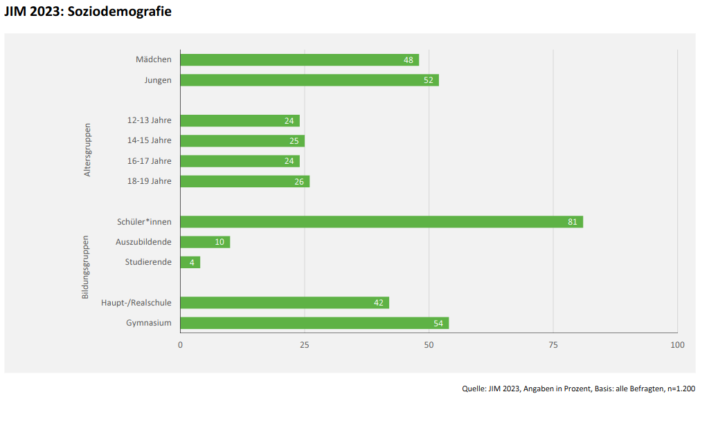 „2023 sind Jugendliche durchschnittlich 224 Minuten täglich online. Dabei spielen insbesondere Messenger und Social Media eine große Rolle. WhatsApp wird von 94 Prozent regelmäßig genutzt. Instagram belegt mit 62 Prozent Platz zwei, gefolgt von TikTok mit 59 Prozent und Snapchat mit 49 Prozent. Wenn es um onlinebasierte Möglichkeiten geht, Serien, Sendungen und Filme anzusehen, sind vor allem Netflix und YouTube bei Jugendlichen sehr beliebt. 63 Prozent nutzen hierfür regelmäßig YouTube (2022: 50 %), 50 Prozent Netflix (2022: 53 %). Jedes dritte Mädchen und jeder vierte Junge wurde 2023 im Netz schon einmal sexuell belästigt. 23 Prozent wurden im letzten Monat vor der Befragung ungewollt mit pornografischen Inhalten konfrontiert.“
